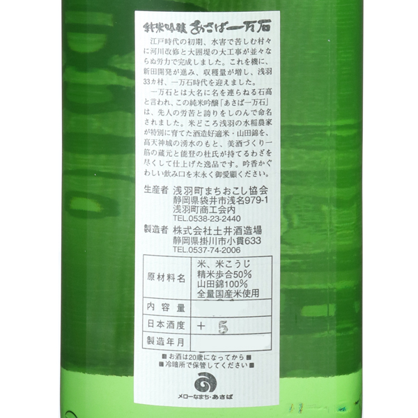 一万石とは大名に名を連ねる石高と言われ、あさば一万石は先人の労苦と誇りをしのんで命名されました。開運を醸す土井酒造場からほど近い、浅羽水稲農家が特別に育てた酒造好適米 山田錦で醸した新酒純米吟醸酒です。柔らかな口当たりと吟醸香をお楽しみ下さい。蔵紹介