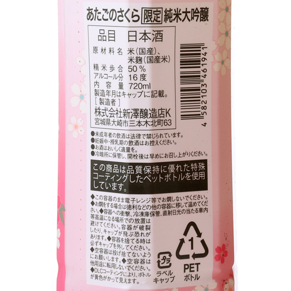 人気蔵新澤醸造店が醸す「あたごのさくら」が日本酒PETになって入荷。桜咲き誇るラベルの通り、春の期間限定アイテム!食卓を彩るほのかに香る吟醸香があり、程よい甘味と酸味が絶妙なバランスの純米吟醸です。便利なペットボトルでさらに幅広いシーンでお楽しみ下さい。