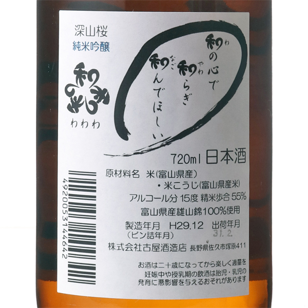 「青葉まじりにみずみずしく咲く深山桜」とうたわれた酒蔵明治24年、1891年創業。皇女和宮の行列が歴史の道、中山道を往った頃、弁財天の森を後ろに抱いて「青葉まじりにみずみずしく咲く深山桜」とうたわれた酒蔵が生まれ、今に地酒を伝えています。限定流通の和「和和和」は(わ)の心で和(やわ)らぎ、和(なご)んでほしいという心で醸される特定名称酒のみで構成された銘柄です。非常に小さな酒蔵で、少量生産ですが、丁寧な手仕事により調和のある爽やかな日本酒を醸しています。