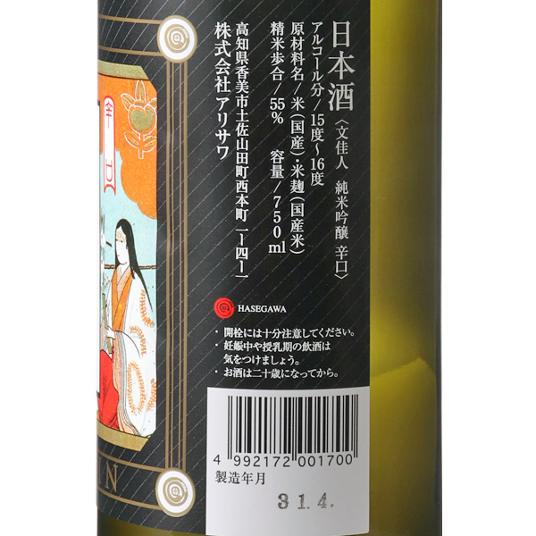 学問に秀で、教養にあふれた美人のお酒!明治10年創業。蔵の代表銘柄である文佳人とは、およそ400年前、土佐藩執政の野中兼山の娘で、お椀さんと呼ばれた女性に由来します。映画化もされた大原富枝さんの小説、「婉という女」は、このお婉さんについて書かれています。蔵の二代目は、このお婉さんを称え文佳人という銘柄としました。文佳人つまり文の佳人、手紙・文・詩歌・広くは学問に秀で、教養にあふれた美人である、と記念したのです。文佳人は、搾りたての酒がもつみずみずしい香りをそのまま味わってもらいたいという想いから、無濾過にこだわっています。さらに火入れ後マイナス5度の冷蔵貯蔵という徹底した管理がされています。清涼感のある飲み飽きしない味わいをぜひご堪能ください。