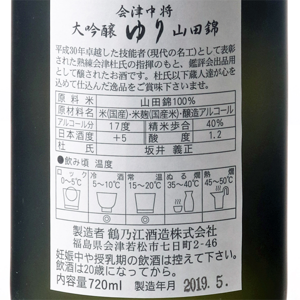 熟練会津杜氏の指揮のもと鑑評会出品用として醸す逸品。香りたち膨らみのある辛口です。山田錦40%精米を使用。注意事項