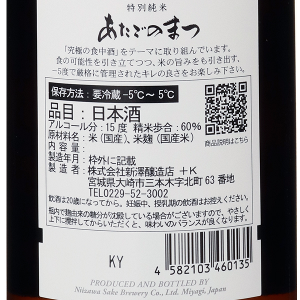 飲み疲れしない究極の3杯目を作ろう。創業1873年。2002年に宮城県最年少杜氏となった新澤巌夫社長を筆頭に、若き蔵人が集まる期待の蔵元です。 出荷管理には特に気を配り、しっかりと冷蔵管理のできる酒販店だけに販路を限定しており、全てのお酒は、生詰めで瓶燗火入れ、瓶貯蔵が行われ、酒質が少し若く、固い状態で出荷されます。 その理由は、流通の過程から消費者が口にするまでの時間経過を考えての事です。 究極の食中酒を意識し、一層食材を引き立てること、また、冷で爽やかな酸がいきてくるように造りに取り組んでいます。