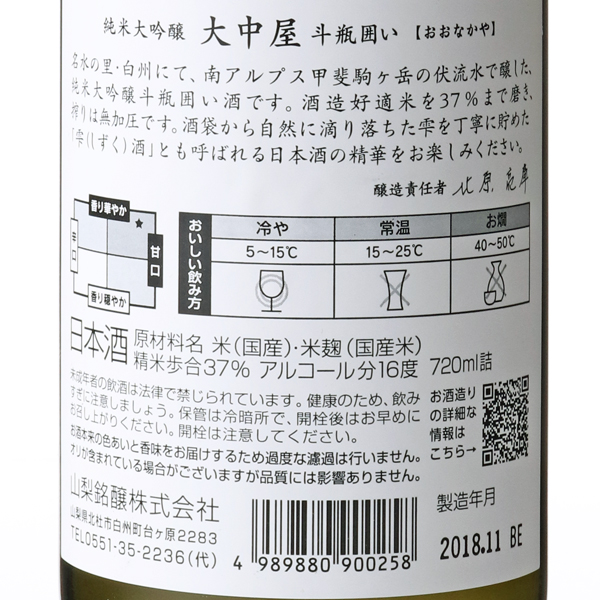 純米大吟醸の斗瓶囲い酒です。山田錦を37%まで磨き、搾りは無加圧です。酒袋から自然に滴り落ちた雫を丁寧に貯めた雫酒とも呼ばれる日本酒の精華をお楽しみください。注意事項