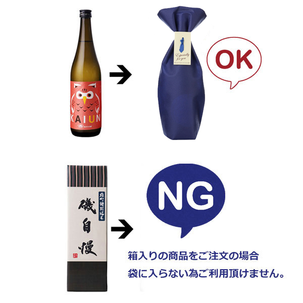 ・ご注文いただいたお酒がはじめから箱付商品だった場合は、不織布に収まりませんのでご利用頂けません。和紙がけ・包装・熨斗がけに変更して出荷させていただきます。