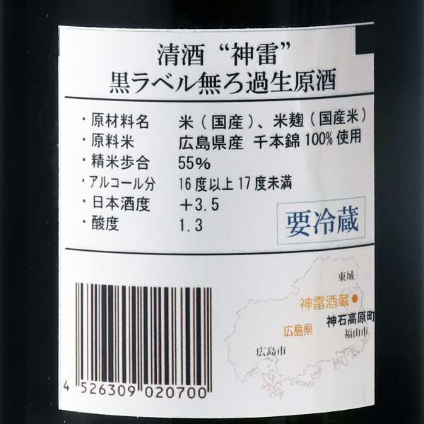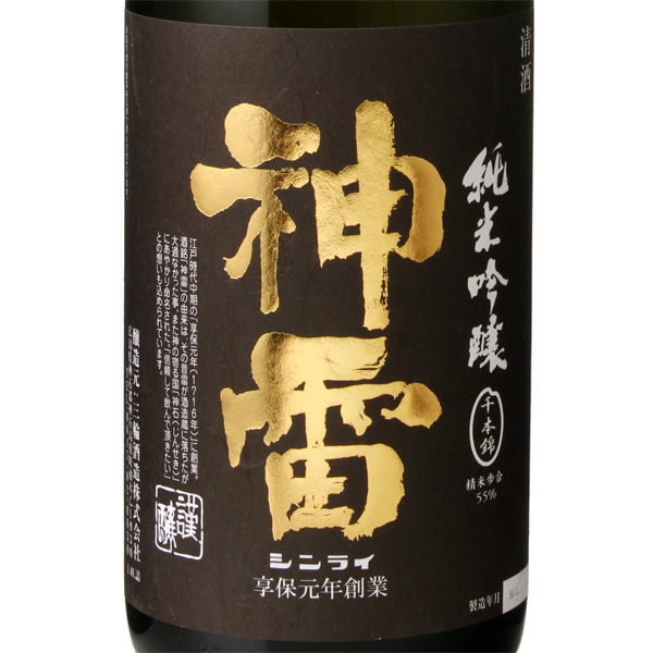 課せられた使命は、先人たちが築き上げた清酒という文化を伝承し、生活の潤いを、人生の喜びと悲しみを、共に味わっていくこと1716年創業。酒銘の神雷の由来はその昔雷が酒造蔵に落ちたが、大過なかったこと、また神石にあやかった事から。ちなみに稲妻は稲の妻と書くとおり、豊かな恵みをもたらす象徴であることから、大変縁起の良い名前です。酒蔵は中国山脈の山あい、標高500mに位置し、冬場は氷点下を記録します。さらに夏場も涼しいため、お酒の仕込、貯蔵共に大変適した環境が整っています。また、裏山の井戸から軟水、蔵の地下からは中硬水が得られ、用途によって使い分けが出来るのも特徴となっています。