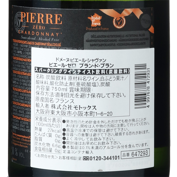 フランス南部で丁寧に栽培されたブドウを、鮮度とアロマが壊れないよう気温の低い夜間に収穫。 そのブドウから醸造のプロがワインを造り、「スピニング・コーン・カラム」法でアルコール分を短時間かつ穏やかに除去。「ピエール・ゼロ」はワイン本来の華やかな香りと、ポリフェノール、タンニン、ビタミン、ミネラル、抗酸化物質などの栄養素もワインを飲んだ時と同じようにしっかり楽しめる、シャンパーニュのブラン・ド・ブランの趣を表現したアルコール度数0%のスパークリングワインテイスト飲料です。世界最優秀ソムリエから届いたテイスティングコメント「まるでワインのよう」