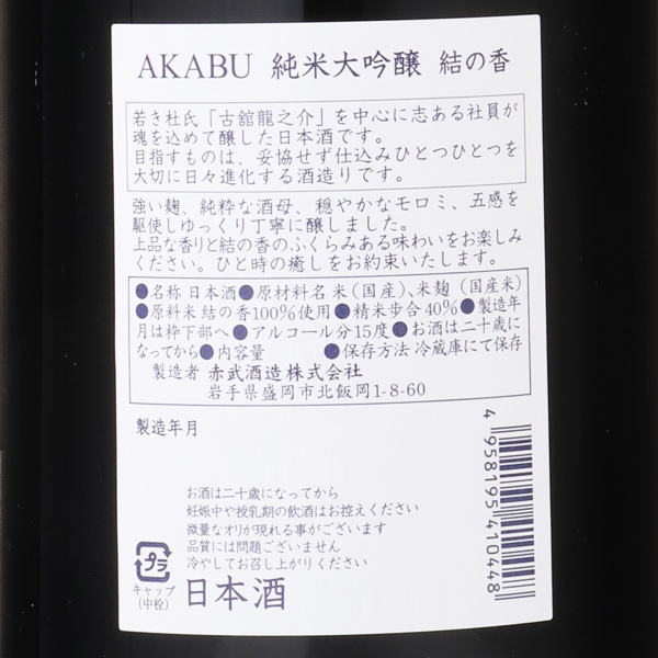 岩手の最上級酒米結の香を使用し、雑味のない濃厚な旨味を追求しました。フルーティーな香りと味わい、透き通るような喉ごしが特徴。上品な甘みが口の中に広がる、ちょっと贅沢なAKABUです。結の香とは、山田錦に匹敵する酒米を育てたいとの思いから、岩手県で長年研究を重ね、華想いに山田錦を掛け合わせ誕生した酒米です。酒造関係者、農家、研究機関をはじめ沢山の人の結びつきから生まれた事が名前の由来になっています。