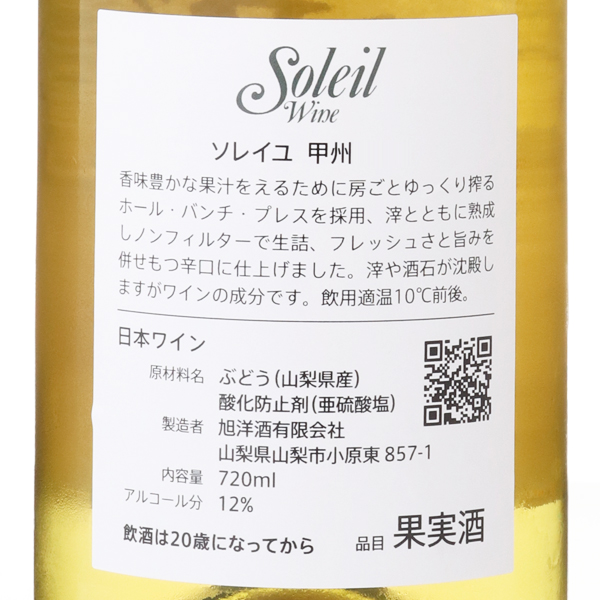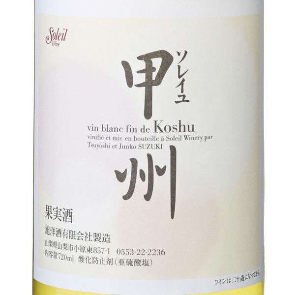 少数限定の契約農家のブドウを用い、渋味を抑え香味豊かな果汁をえる目的で除梗破砕せずに房ごとゆっくり搾るホール・バンチ法で圧搾しています。醗酵後は滓とともにタンクで貯蔵しフレッシュさと旨みを併せもつ辛口に、複雑さを生かすためノンフィルター生詰で仕上げています。夏から秋、冬から春にかけて緩やかに熟成し味わいの変化を楽しむことができます。フレッシュリンゴや和柑橘など透明感のある香。アタックはやや硬質な酸を感じるものの、すぐに八朔様の果実味が弧を描きながら伸び、みずみずしい味わいがユルユルと持続。辛口ながら酸の肌理に詰まった果実味が「おいしい水」のような甘みを感じさせます。甲州種特有の果皮からくる渋みは少なく、余韻も澄んでたおやかです。