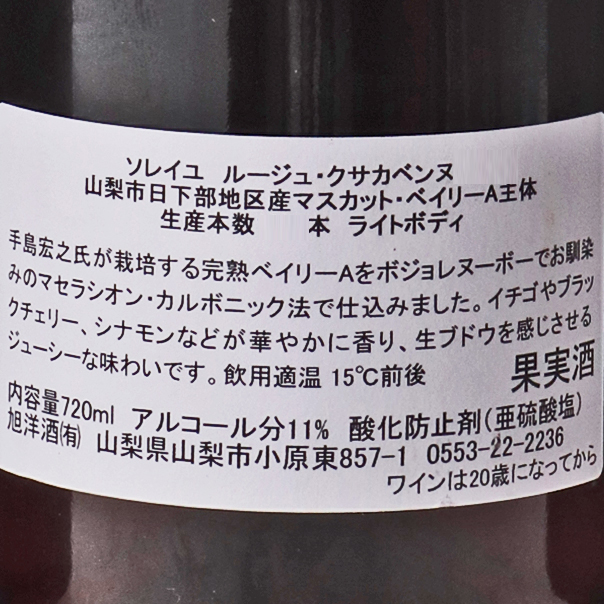 名前の由来である日下部地区の果樹農家・手島宏之氏がワイナリーのすぐ裏手で栽培するマスカット・ベリーA。管理が行き届いており健全なまま完熟する優等生です。この畑のブドウを主体とし、同程度の熟度に達した同地区のベリーAを合わせボジョレ・ヌーボーでお馴染みのマセラシオン・カルボニック法で仕込みました。イチゴジャムやブラック・チェリーの他シナモンやアニスなどのオリエンタルスパイスが華やかに香リ、ブドウネクターを思わせる質感と梗からくるタンニンにのって果実の旨みが広がり長く余韻します。アルコールは低めでライトボディとありますが独特の重厚感があり、濃い味の料理にも負けません。【オススメ料理】肉汁たっぷりのボロネーゼ、リエット、レバーなどのこってり味、甘辛醤油味の和食、香味を効かせた中華などと。杏仁豆腐やプリンなどデザートとの相性が良いです。