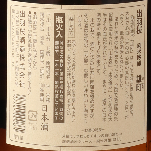 雄町を50%まで磨き、山形酵母で醸した純米吟醸です。上品で華やかな香りと、柔らかい甘味のある口当たりから、次第に心地よい酸と上品な旨味が広がります。後口にかけて雄町らしいミネラル感があり、長い余韻が楽しめます。蔵紹介
