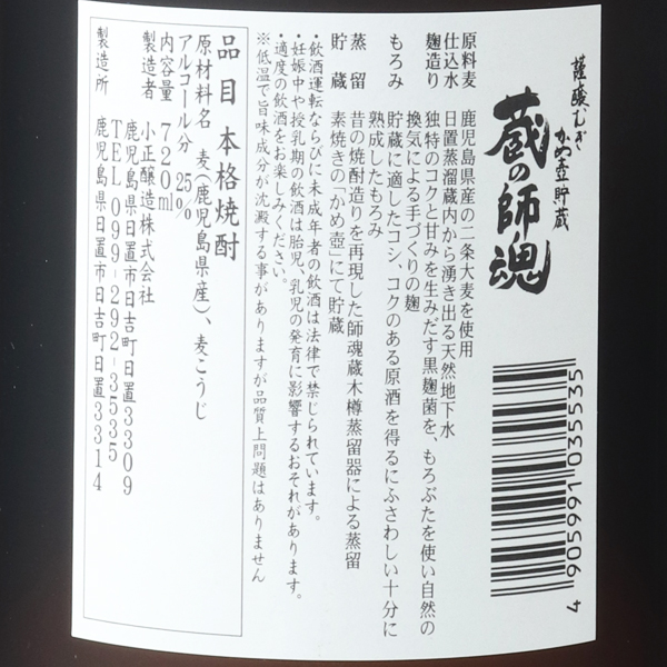蔵の師魂 謹醸むぎ 麦焼酎 25度 / 小正醸造