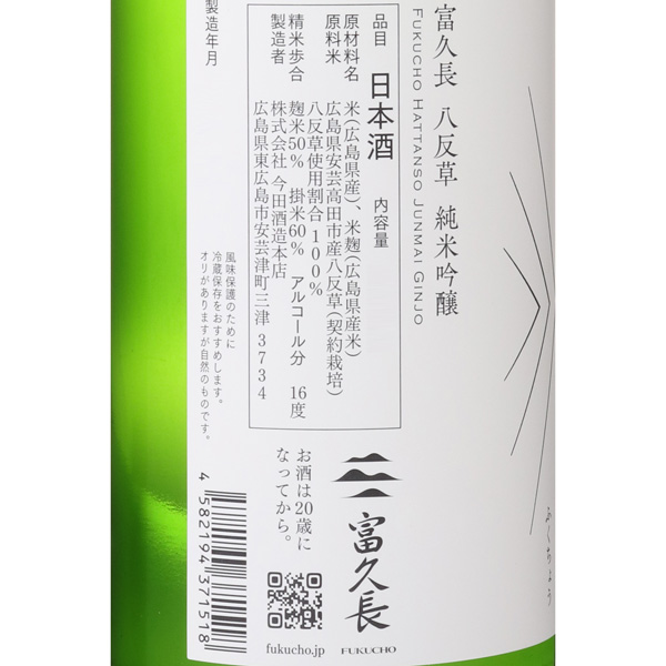 富久長が復活栽培した八反草を、安芸津で受け継いだ伝統の吟醸造りで醸しました。口当たりは柔らかで、旨味たっぷりなのに見事なまでスカッと切れるあと口のよさは、八反草ならでは。ポテンシャルを最大限に引き出した富久長のフラッグシップといえる銘柄です。直汲み原酒を1本ずつ丁寧に瓶火入れ、瓶貯蔵しているので、搾りたてのフレッシュな風味を保っています。受賞歴