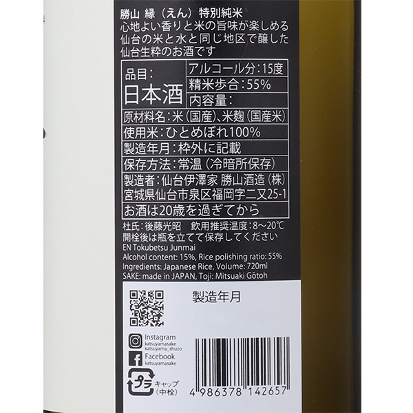 仙台で現存する唯一の伊達家御用蔵元禄元年、1688年に伊達政宗公を藩祖とする伊達家六十二万石の城下町仙台にて創業。その後、320年以上の間酒造りを続けている由緒ある酒蔵です。蔵のある地域は、お米を中心とした穀倉地帯で、泉ケ岳から湧き出る水は、勝山の仕込み水として深井戸より汲み上げ使用しています。水質は酒造りに適した軟水で、美人成分の天然シリカを多く含む、柔らかくキレイな水質となっています。勝山酒造のお酒は純米酒のみに特化しており、1週間にタンク1本の贅沢な仕込を行っています。様々な料理との相性が良く、多様な飲み方を楽しんで頂けます。