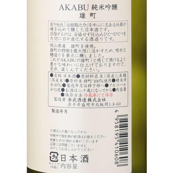 注目はその6代目が醸す日本酒「赤武 AKABU」。2014年より岩手を代表する純米酒を目指して開発しました。ちなみに6代目は1992年生まれの30代。大学時代は利き酒大会の全国チャンピオンになったこともあります。頑固な職人魂を継承し、赤武が日本を代表する純米酒になるよう醸します。蔵人の平均年齢も若く元気いっぱい。「赤武酒造の新しい歴史を創る」の合言葉で集まった若者たちが、時代に合う酒造りを理解し、岩手から情熱と愛情と根性で醸す酒を造りあげています。