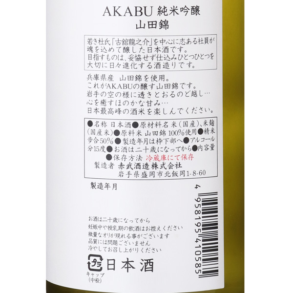 兵庫県産「山田錦」を使用、これがAKABUの醸す山田錦です。岩手の空のように透き通るのど越し、心を癒すほのかな甘味、日本最高峰の酒米を楽しんでください。蔵紹介