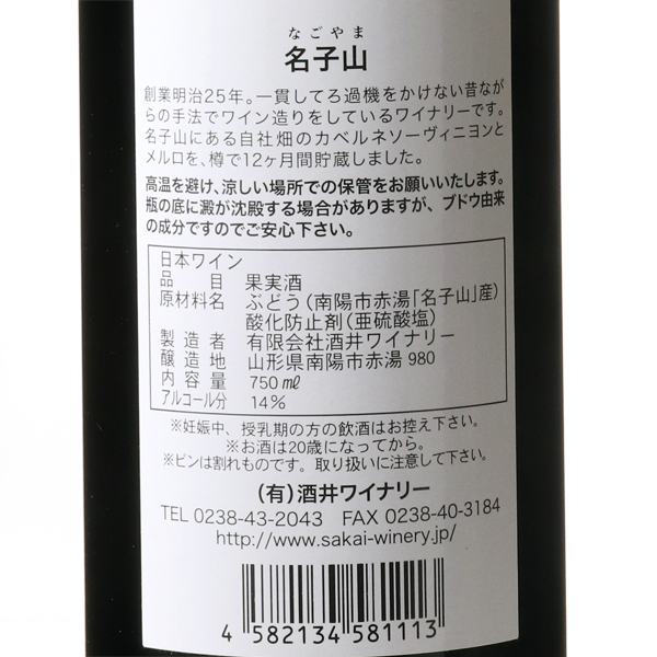 酒井ワイナリーは、明治25年創業者酒井弥惣により赤湯の鳥上坂に葡萄を植え、葡萄酒を作り始めた、東北最古のワイン屋です。鳥上坂 名子山にある自社畑産のカベルネソーヴィニヨンとメルロをブレンドし、樽で12ヵ月貯蔵しました。メルロの柔らかな口当たりと、カベルネの骨太な酸味と渋みがバランスよく調和しています。熟成によって本来の果実味がより鮮やかになっていく長熟タイプの赤です。化学肥料、殺虫剤、除草剤、などを一切不使用で、羊などの動物と一緒に自然に寄り添ったブドウ栽培を行っています。蔵紹介