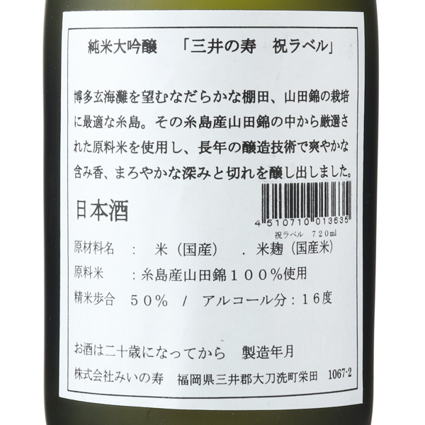 酒造りは、科学とセンスと情熱大正11年、1922年 福岡県三井郡大刀洗町に創業。「三井の寿」は地元福岡のみならず、東京や大阪、さらには世界の舞台でも高い評価を得ています。最近の技術による酒造りで化学も使いながら、自然学、人間学など様々な学びも含めた科学に基づく酒造り。また蔵元杜氏の井上宰継氏が持つ希有のセンスと美味しい日本酒を造るための情熱により、瞬く間に人気銘柄となりました。日本酒概念に捉われない「イタリアンラベル」シリーズや、山廃仕込による「美田」シリーズなど、数多くのお酒を生み出し日本酒ファンを増やし続けています。