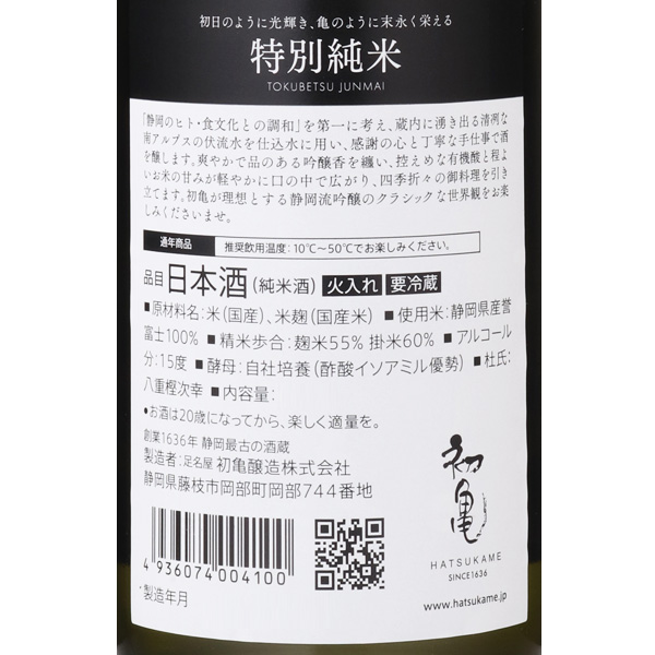 高品質の玉露の産地だけでなく、高品質の日本酒もあります!寛永12年、1636年創業。現在の静岡市で創業し、明治初期の頃に現住所である岡部町に移りました。岡部町は東海道五十三次の宿場として栄えたことで有名で、初亀は旅人の癒しとして愛されていました。現在では高品質の玉露がとれることでお茶が有名です。そんな蔵元の酒造りは、兵庫県東条産の山田錦を始め、富山県南砺産の五百万石、雄山錦とこだわった原料を蔵内に流れる南アルプスの伏流水で醸します。量より質にこだわり、お客様の為に日々酒造りに勤しんでいます。