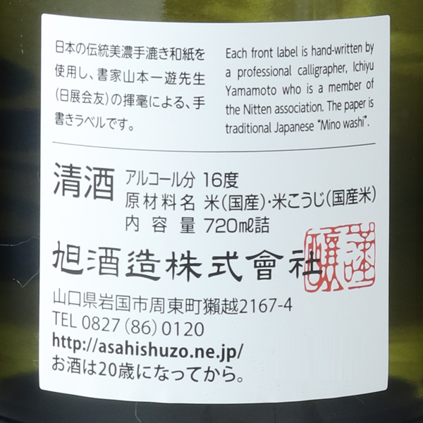 獺祭の最高峰である「磨きその先へ」は、「磨き二割三分」を超えるものとして造られました。常識的な純米大吟醸では踏み出せない酒質を目指し、造りの技術面においても、常識的な製造技術から一歩踏み出しました。美しい香りと両立する味の複雑性・重層性と長い余韻。日本の伝統美濃手漉き和紙を使用、書家山本一遊先生の揮毫によるラベルです。