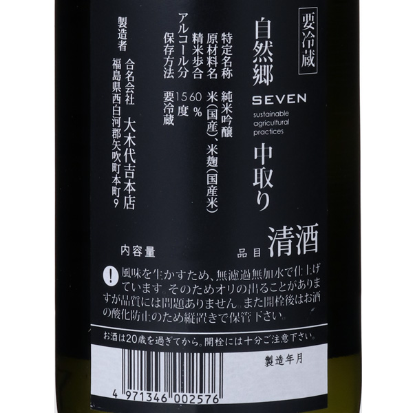 自然郷の「セブン」シリーズは、福島県が独自に開発した「うつくしま夢酵母(F7-01)」という酵母を用いて「食事に寄り添うお酒」をコンセプトに醸したお酒です。代表銘柄 自然郷セブンの香りと味わいの調和のとれた中取り部分を贅沢に瓶詰し、年に1回限定で発売します。マスカットやメロン、白桃の様な香りにピチピチ爽やかな口当たり、クリアでスッキリとした甘味を感じながら余韻はなめらかな口当たり。飲み飽きしない味わいです。蔵紹介