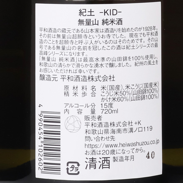 紀土ブランドの最高峰シリーズ無量山!!日本一の美味しい日本酒がテーマです。酒米には全て特A地区の山田錦を使用。紀土の原点である紀州の柔らかできれいな水を用い、紀州の風土の至高の味わいを求めます。蔵紹介
