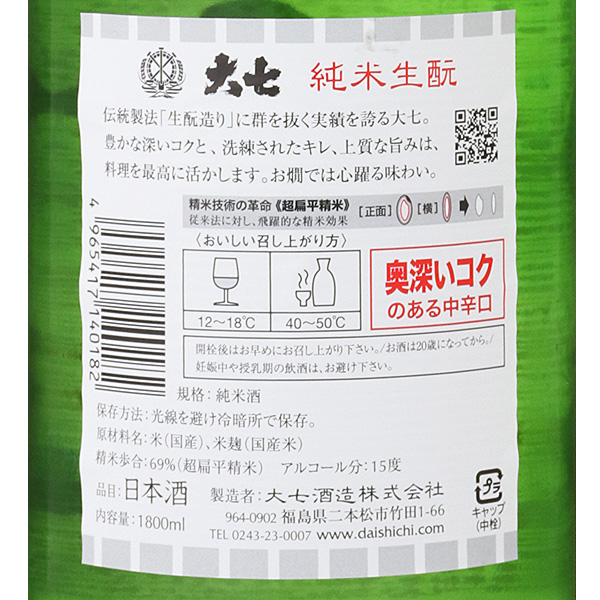 日本酒の最も正統的な醸造法生もと造りに、全国随一の実績を誇る大七の自信作。当代随一の名工たちが腕をふるいます。生もと特有のクリーム系の香りが上品に広がり、口当たりはまろやか。豊かなコクと旨味、酸味が完全に解け合い、後味のキレも抜群です。約一年間しっかりと熟成させているため、力強さと滑らかさが増し、お燗にすることでその美味さがより引き立ちます。アン肝、海老のクリームシチュー、チーズハンバーグなど、ふくらみのある旨味をもったクリーミーな料理や、サーモンのハラス、鶏のから揚げなど、脂ののったお料理とも相性抜群です。蔵紹介
