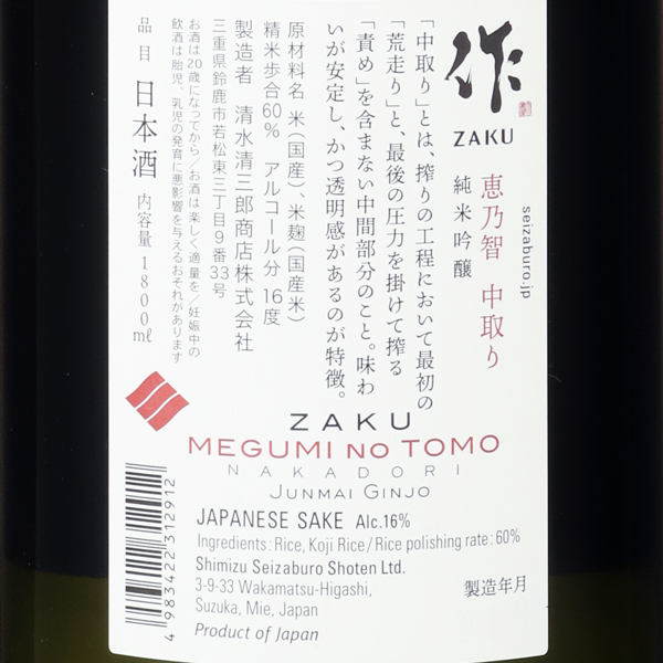 伊勢杜氏の伝統を引継ぎ、「味酒」を醸しています。鈴鹿山脈の清冽な伏流水は、酒造りに非常に適しており、伊勢平野は良質な米を我々に与えてくれました。1869年(明治二年)に若松村にて大黒屋清水清三郎商店として創業。若松は海に面しており港も近いために、かつては多くの醸造業が繁栄しましたが、現在では当社は鈴鹿市で唯一の蔵元となってしまいました。昔ながらの伊勢杜氏(農閑期の出稼ぎではない地元の杜氏による酒造り)の伝統を引き継ぎ、鈴鹿で生まれ育った杜氏が歴史史実に負けない「味酒」を精魂込めて醸しています。