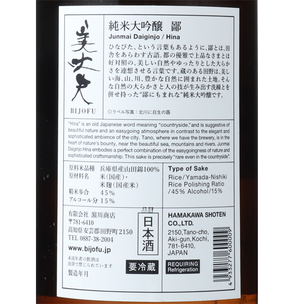 上品な香りと味わい。ボリュームのある味わいとさっぱりした後味が楽しめる飲み飽きしない仕上がりです。鄙=ひなとはひなびた、という言葉もあるように田舎を表す古語。都の優雅で上品な様とは好対照の、美しい自然やゆったりとしたおおらかさを連想させる言葉です。蔵のある田野は、美しい海、山、川、豊かな自然に囲まれた土地。そんな自然のおおらかさ人の技が生み出す洗練とを併せ持った、鄙にもまれな純米大吟醸です。受賞歴