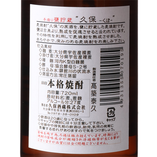 久保 手造り甕貯蔵 麦焼酎 27度 / 久保酒蔵