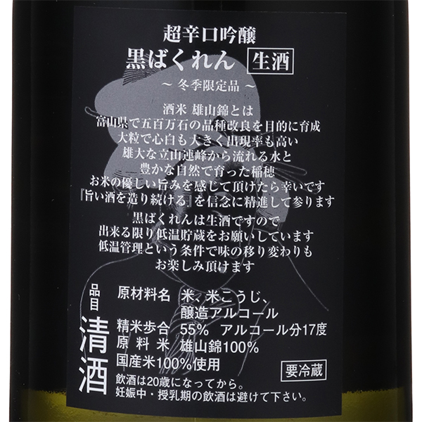 雄山錦は栽培しやすい吟醸酒向きの品種を目的に育成された酒米です。心拍は大きく、醪で溶けやすく、酒質に幅が出やすい特徴があり、富山県で主力品種である五百万石の未来派として注目されています。生酒で楽しむ事が出来る、この季節限定の黒ばくれんは濃醇うま辛口。のどこし良好、辛口ラバーは必飲の味わいです。*イメージ画像と瓶色が異なる場合がございます、あらかじめご了承下さい。