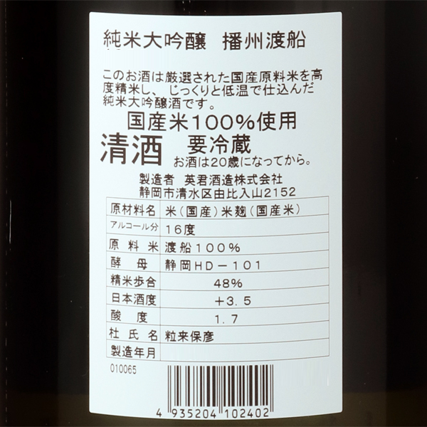 純米大吟醸らしい果実を思わせる吟醸香に、丸みのある口当たりが上品です。滑らかでボリュームのある旨味が広がり、ほどよい酸味によるバランスの良さが感じられます。兵庫県産渡船48%精米を使用。蔵紹介