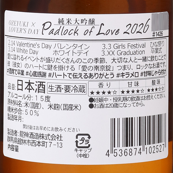 バレンタインからひな祭り、ホワイトデーや卒業式など、愛に溢れるイベント盛りだくさんのこの季節限定酒。大切な人と一緒に飲む事で、お互いのハートに鍵を掛ける『愛の南京錠』つまり、ロックなお酒です。甘い愛を表現したsweet&mellowな味わいが特徴。華やかな果実香と糖蜜を想わせる心地よい甘味の余韻が続く、官能的な美酒をお楽しみください。蔵紹介
