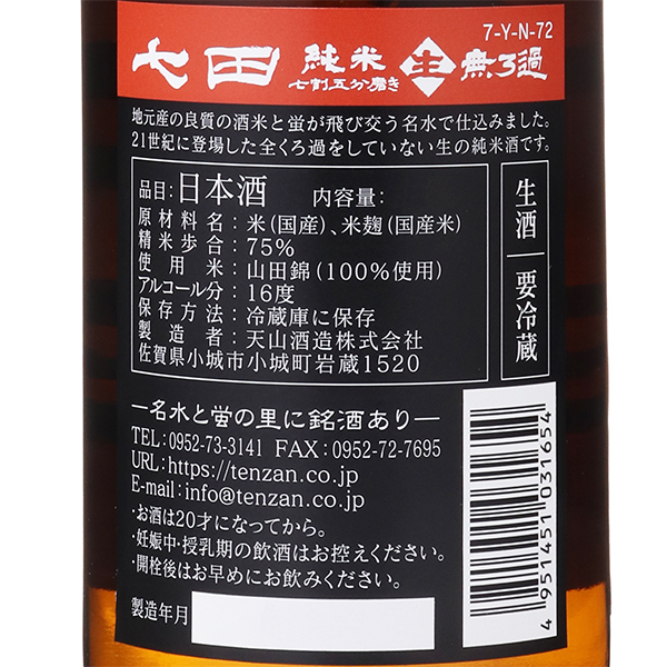 七田 純米 山田錦 七割五分磨き 無濾過生