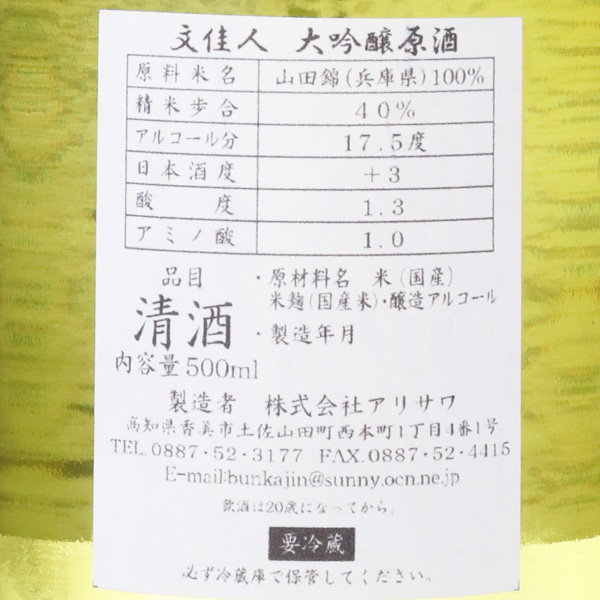 文佳人は、搾りたての酒がもつみずみずしい香りをそのまま味わってもらいたいという想いから、無濾過にこだわっています。さらに火入れ後マイナス5度の冷蔵貯蔵という徹底した管理がされています。清涼感のある飲み飽きしない味わいをぜひご堪能ください。
