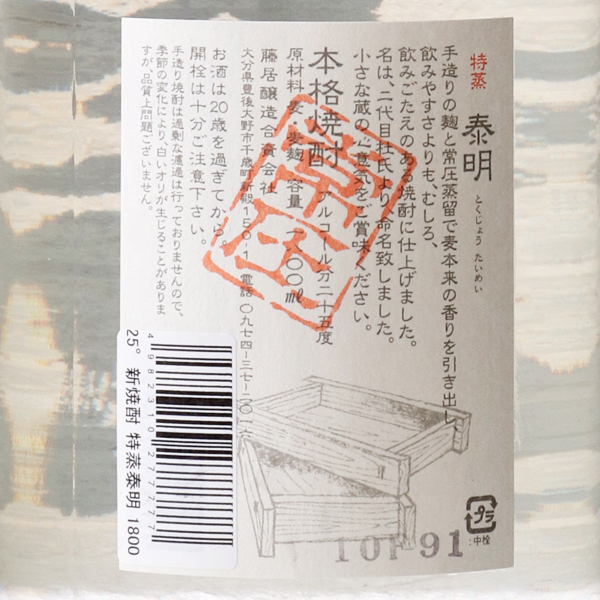 特蒸 泰明 新焼酎 麦焼酎 25度 / 藤居醸造