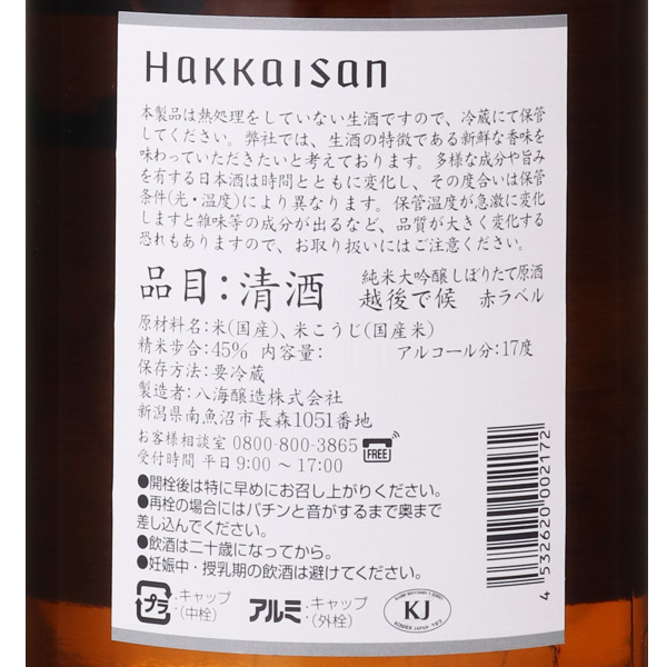 八海山 純米大吟醸 越後で候 赤ラベル しぼりたて原酒