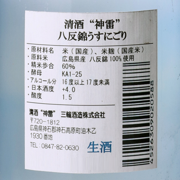課せられた使命は、先人たちが築き上げた清酒という文化を伝承し、生活の潤いを、人生の喜びと悲しみを、共に味わっていくこと1716年創業。酒銘の神雷の由来はその昔雷が酒造蔵に落ちたが、大過なかったこと、また神石にあやかった事から。ちなみに稲妻は稲の妻と書くとおり、豊かな恵みをもたらす象徴であることから、大変縁起の良い名前です。酒蔵は中国山脈の山あい、標高500mに位置し、冬場は氷点下を記録します。さらに夏場も涼しいため、お酒の仕込、貯蔵共に大変適した環境が整っています。また、裏山の井戸から軟水、蔵の地下からは中硬水が得られ、用途によって使い分けが出来るのも特徴となっています。