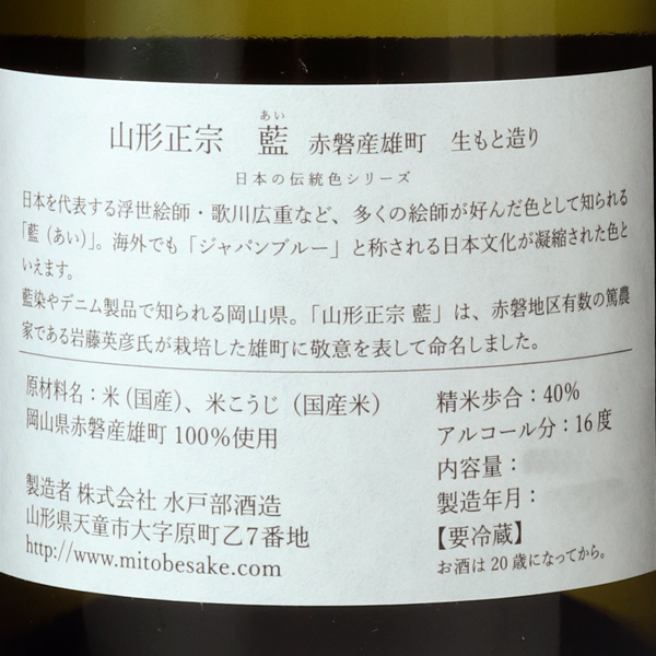 山形正宗を代表するお酒として、長年の構想を経て誕生したのが「日本の伝統色シリーズ」です。従来の大吟醸のイメージに追従するのでなく、自分たちで育てた米であったり、本当に素晴らしいと思える原料米を使用して、いろいろな実験を重ね、スペック関係なしで心から美味しいと思えるお酒こそ、山形正宗のフラッグシップにふさわしいという想いで造られています。素晴らしい原料米に対する敬意と、それを使えるうれしさを表現した山形正宗の最高峰を是非味わってみて下さい。蔵紹介