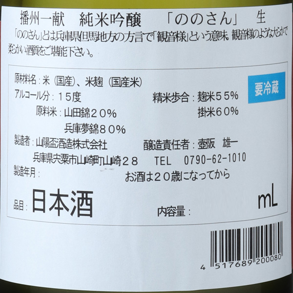 兵庫県の酒米にこだわる「播州一献」。真吟精米(米の厚さ方向を削ることで、タンパク質を効率よく削ることが可能な精米方法)した山田錦と兵庫夢錦を使用。透明感ある上品な口当たりと、艶やかな質感、抜群のキレを兼ね備えた上級クラスの超辛口。ルビーグレープフルーツの様な軽快で爽やかな酸と甘味が特徴的です。ののさんとは但馬地方の方言で観音様という意味。観音様のようなおおらかで柔らかい酒質です。#はせがわ酒店スタッフの、私これ買いました!