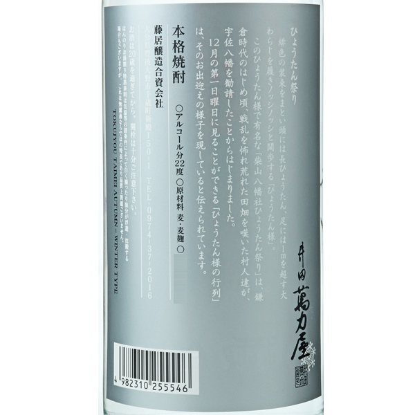 あるがままを大事にし、こころで醸した焼酎。1929年創業。大分県の南部、豊後大野市に蔵はあります。蔵の真後ろには麦畑が広がり、穂が実ると一面金色に輝きます。昔ながらの製造方法を続け、原料の蒸しからラベル貼りまで完全手造り、さらに原料も地元契約農家の完全無農薬の物を使用するこだわりっぷりです。藤居醸造の焼酎は飲みやすさよりも飲みごたえにこだわっており、濃厚で芳醇な香りとコクが楽しめます。こんな焼酎があったんだと思ってもらえる商品を、日々研鑽を重ねて造っています。