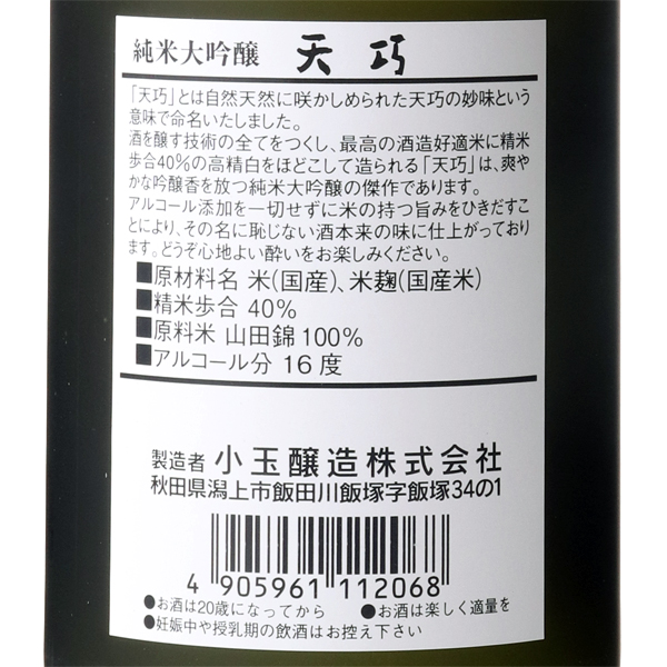 酒を醸す技術の全てを尽くし、最高の醸造好適米を精米歩合40%の高精白をほどこして造られる天巧は、爽やかな吟醸香を放つ純米大吟醸の傑作であります。アルコール添加を一切せずに米の持つ旨みを引き出すことにより、その名に恥じない酒本来の味に仕上がっています。受賞歴