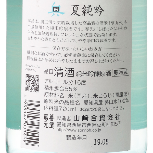 夏向きにアルコール度数を低めに仕上げた純米吟醸原酒です。香味の調和をはかるため、原料米の精米歩合から仕込配合、使用酵母も工夫しました。新酒を火入後、フレッシュな 状態で出荷します。さわやかな香りとのどごしで、やや辛口のお酒です。蔵紹介