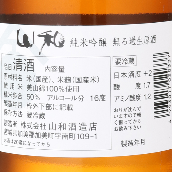 いい意味で期待を裏切るお酒明治29年、1896年創業。山形県に隣接する宮城県加美郡加美町に蔵はあります。蔵のある一帯は穀物地帯であり、豊富な米を収穫することができ、宮城を代表する米「ササニシキ」発祥の地である大崎平野が東に広がっています。蔵の代表銘柄「山和」は、2004年に誕生しました。米洗いから搾りまでをなるべく人の手で行い、丁寧な仕込みをされた純米酒だけのシリーズとなっています。目指す酒質は1杯目よりも2杯目3杯目に美味しいと感じられるお酒。流行に乗るのではなく、これが本当においしいお酒だと感じさせてくれるお酒です。