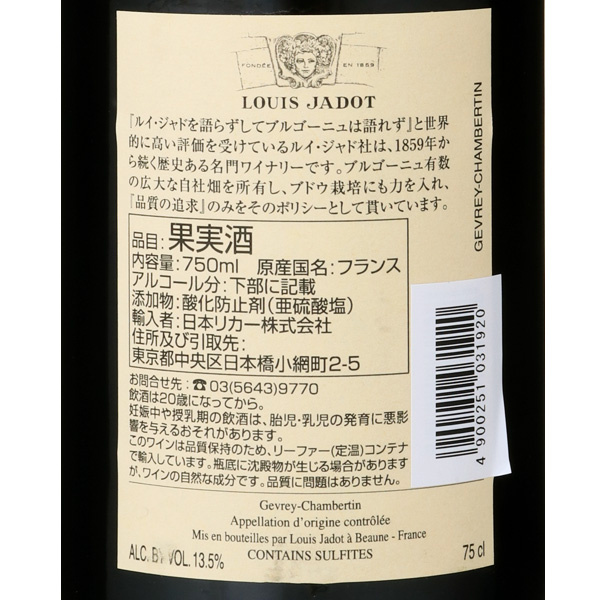 ジュヴレ・シャンベルタン村にある畑は品質の個性に非常に違いがあるため、生産者の名前が、他の村のワインに比べてワインの品質に特に重要な意味を持っています。深い色合いと、ベリー系果実の複雑で奥深い香り、タンニンがしっかりしたフルボディのワインです。蔵紹介