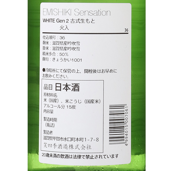 貴醸酒や花酵母の日本酒など様々な日本酒を手掛ける「笑四季」が提案する定番酒 Sensationシリーズが全量古式きもと仕様にリニューアル!きょうかい1001号由来のフレッシュさと奥ゆかしい吟醸香ときれいな甘味、軽快な切れ味が楽しめ、和の食材との親和性を高めます。Blackラベルに比べ、やや酸を控えめに仕立てており、甘さと酸の調律が心地よいお酒です。蔵紹介