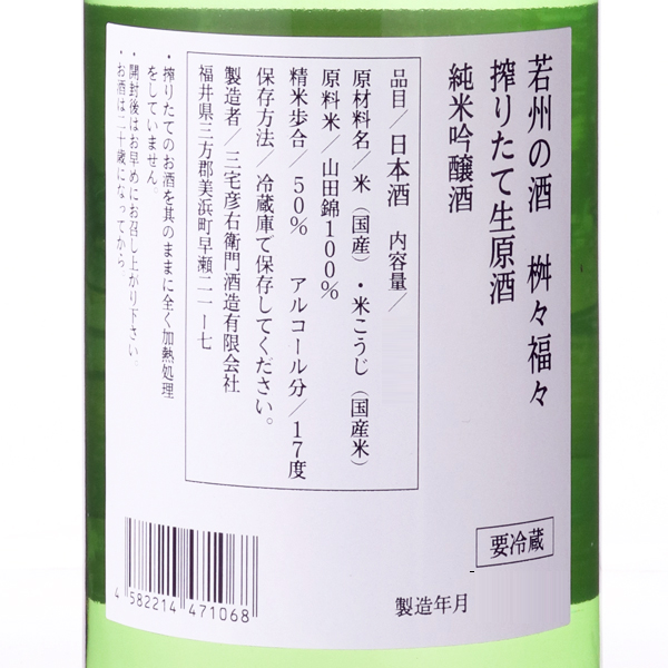 山田錦を50%精米で醸した純米吟醸の生酒です。スッキリとした爽やかな飲み口、酔いごこち爽快。飲んで皆、自然にエビス顔になります。透き通った酒質は深く透明な日本海のイメージです。白身魚や甲殻類と相性抜群、冬の幸のお供にいかがでしょうか。蔵紹介