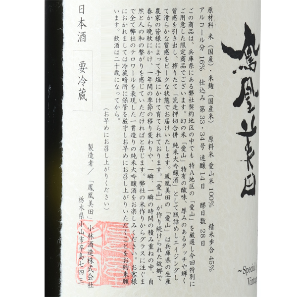 地元に根差した愛される酒、愛される酒蔵を目指す。明治5年、1872創業。栃木県の小山市に蔵はあります。日本酒の製造だけでなく、リキュールも製造しており、桃やゆず、期間限定で出荷されるいちごのリキュールなどファンが多くいます。蔵元一丸となり、全量吟醸仕込みで丁寧に醸されている代表銘柄「鳳凰美田」。地元の契約農家と連携し、有機栽培米を使用した酒造りなどにもチャレンジしています。その味わいは華やかで煌びやかな味わいのものが多く、女性にも非常に好まれています。