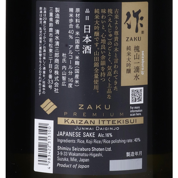 ワンランク上の味わいを追及したプレミアムシリーズ。精米歩合40%の酒造好適米山田錦を、低温でゆっくりと醸しました。華やかな香りが蔵に満ち溢れる頃、もろみを入れて吊るした小袋から、余分な力を与えずに、したたり落ちる滴だけを集めて瓶に詰めることで究極の透明感を求めた酒です。古来より尊貴の木と言われてきた槐(えんじゅ)のごとく、気高く上品な味わいと、心地よい余韻を持つ純米大吟醸です。注意事項
