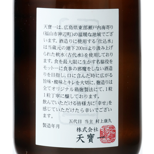 瀬戸内の恵みと和食に合う、究極の日本酒1910年に創業。福山を玄関口に、10kmほど北上した場所に位置する、“神の辺り”「神辺」の地で100年以上続く天寶一は、今では福山市唯一の酒蔵です。酒蔵が常に大切にしているのは、食事との調和です。超軟水である古代水と丁寧な絞りが生み出す「柔らかな酸」が、フレッシュなキレの中に、心地よい余韻を運んできます。瀬戸内の小魚などとも相性が良く、料理を引き立てるうえでは、欠かせない食中酒です。