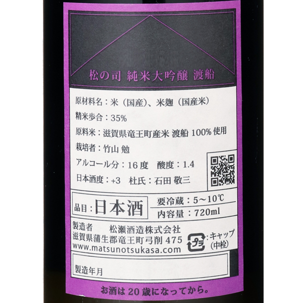 地下120Mの大きな岩盤の下を流れる鈴鹿山系愛知川伏流水を仕込み水とし、100%契約栽培により栽培法を定め十分に審査された酒米を、蔵人が時間をかけて精米。酒に味わいをつける箱麹法による麹造りや、酒質を決める社内保存酵母菌による速醸酒母と、昔ながらの生もと酒母の採用。また、発酵温度を低温に抑えながらも完全発酵を目指す小仕込み(1.2t以下)によるモロミ工程、そして瓶詰貯蔵による低温熟成管理(5℃以下)など、永年の経験による出来る限り丁寧な手造りで、深遠な味わいの「松の司」を醸しだします。(松瀬酒造HPより)